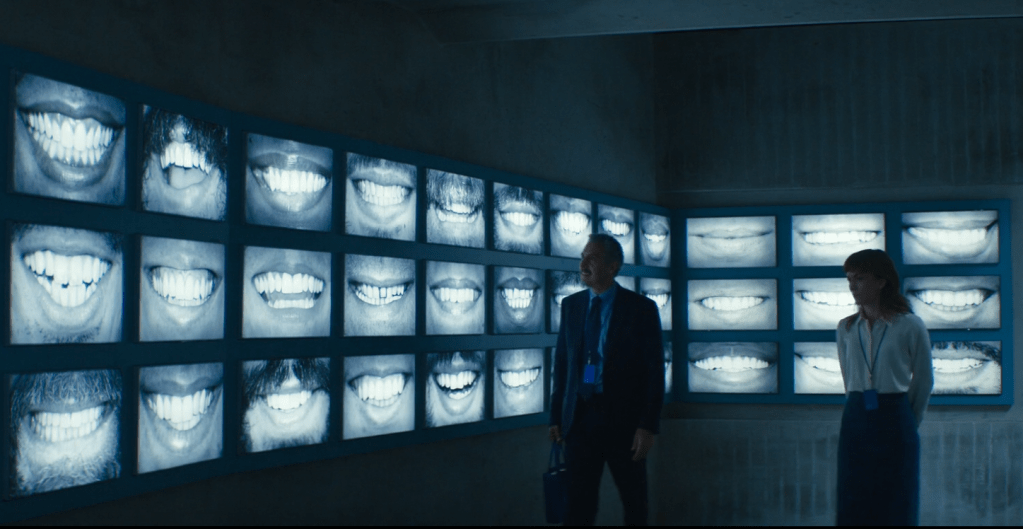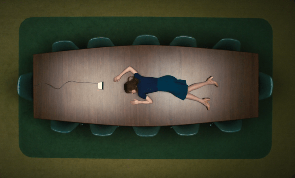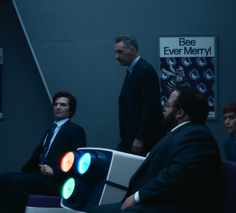 La serie de Apple parte de la premisa de ciencia ficción en la que un grupo de personas acceden a trabajar para una enorme corporación, Lumen, y pasar por un proceso quirúrgico llamado separación, “severance”, por el cual se les implanta un chip en el cerebro, separando o dividiendo sus recuerdos “outies” (creo que en el doblaje está traducido como «fueris») del trabajo de aquellos que viven fuera del trabajo, y viceversa. Esto se muestra visualmente en escenas liminales de ritos de paso en las que los “outies” entran en un ascensor y se convierten en sus yo curritos o “innies” (creo que en el doblaje está traducido como «dentris»). El ascensor baja de algún lugar en la superficie a otro subterráneo, un espacio desconcertante, lleno de superficies planas, decoración retro, pintura blanca y brillante con alfombras verdes y pasillos laberínticos y claustrofóbicos. Después de finalizado el día vuelven a meterse en el ascensor y ascienden, sus cuerpos vuelven a habitar la identidad de fuera del trabajo, y así cada día laboral. Ninguno de los que están allí dentro tiene control alguno ni sobre sus condiciones de trabajo ni sobre la decisión de poder o no dejarlo. Casi todos los que están allí están, digamos, adaptados, y se muestran cooperantes. Mark S (Marx…), que decidió someterse al procedimiento de la separación para olvidarse por unas horas del dolor por la muerte de su esposa, se muestra tranquilo, incluso alegre dentro del trabajo; Irving B (de quién se nos insinuará que es un veterano retirado) comienza la primera temporada como un trabajador no solo complaciente sino adorador de la empresa y sus extraños cultos; Dylan G, cuyo outie está perdido y sin rumbo, puede ser sarcástico y corrosivo, pero disfruta con los incentivos y le hace la pelota a los jefes porque se considera bueno en el trabajo. Todos tienen alguna herida ahí fuera, se nos dice, que les ha llevado a aceptar la separación. Todos, aparentemente, menos Hellie R, de quien descubrimos en el último episodio de la primera temporada que su outie es la hija del magnate de la corporación, Helena Eagan. En principio, su vida ahí fuera es una vida de privilegios, pero se somete a la operación como propaganda y argumento de venta ante aquellos que protestan por la dudosa ética de lo que se vende: si la multimillonaria hija de un magnate lo hace por voluntad propia, para vivir como uno de ellos, ¿cómo va a ser malo? Y es justo su innie, Hellie R, quien no está nada contenta con lo que allí vive, hasta el punto de que intenta suicidarse si con eso mata a su outie, quien en una escena terrorífica le dice: «yo soy una persona, tú no». Será ella, sobre todo, la que impulse una revolución allá abajo, iniciando una reacción en cadena. Pero será también la parte de Mark que, poco a poco, empieza a ser consciente del sufrimiento de quienes lo rodean, empieza a desanestesiarse, tanto fuera como dentro. Y también Irving, el hasta el momento más devoto del culto corporativo, despierta por un amor que duele.