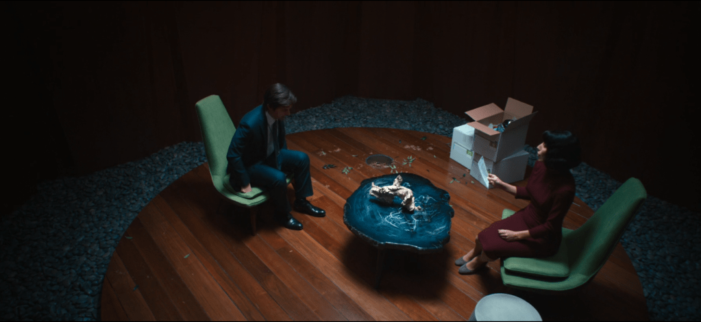 Es por esto que para mí la exploración del sufrimiento está en el centro de la serie. Desde luego, el sufrimiento a manos del capital, las condiciones laborales y de una burocracia deshumanizante e ilógica. Pero también una reflexión sobre lo adecuado o no de enterrar nuestro sufrimiento en lugar de encararlo y qué hace el sistema con el dolor que él mismo genera, directa o indirectamente. El sufrimiento es algo que nos desgarra y nos provoca una herida que tarda mucho en curar y a veces no cura por completo. En ocasiones, como Mark S, buscamos refugio en ese otro yo que trabaja para, por unas horas, olvidarnos de lo que sentimos. Los trabajos mecánicos y automatizados no reclutan ninguna emoción y en ese sentido pueden ser una vía de escape. Sin embargo, parece que esa escisión de Mark y del resto de personajes nunca es perfecta. Como nos enseñan las historias de dobles, siempre hay una grieta por la que se filtra el dolor y nos muestra sus huellas. Hay un momento en el que un personaje, Petey (que había desaparecido y pronto se descubre que había tratado de «reintegrarse» por medio de cirugía para unir los dos yo separados), le dice a Mark que había días que llegaba con los ojos rojos al trabajo y que bromeaban con que le tenía alergia al ascensor, pero que en realidad el dolor que sentía lo llevaba allí dentro también, aunque no lo notase. La teoría de Petey parece corroborarse cuando, poco después, tras atender el funeral de éste, un Mark visiblemente afectado es invocado para una sesión de bienestar donde, al pedírsele que moldee sus emociones con un poco de arcilla, le da forma a un árbol que recuerda ominosamente al árbol contra el que supuestamente se estrelló su esposa en un accidente. El trabajo siempre será un lugar que te facilitará dejar el dolor de lado porque el sufrimiento es contrario a la productividad, que es el mandamiento de nuestros días. Si se muere un ser querido, te conceden unos días para que soluciones los asuntos burocráticos y si los sobrepasas incurres en una infracción y, si me apuras, en un duelo patológico (obviando que el duelo es un asunto no solo personal, sino también cultural, donde el tiempo de duelo que se considera «normal» varía de cultura en cultura). El laboral no es el único contexto en el que no sabemos qué hacer con el dolor. Recuerdo en la escuela sesiones de wellness con el profesor de filosofía, que supuestamente era un psicólogo reconvertido en profesor, y que no desmerecían en nada las sesiones de la señorita Casey en Severance en extrañeza, sobre todo para una chica de quince años. Un día este mismo profesor, jefe de estudios y psicólogo, me hizo una pregunta en clase sobre por qué no había hecho una tarea extraescolar y yo me quedé muda porque, para responderla, tenía que explicar toda la violencia silenciosa del hogar, así que, abrumada, me quedé muda. Me llevaron al director y de ahí al hombre orquesta del instituto que todo lo hacía. También recuerdo como si fuera ayer cuando, de adolescente, le contaba muy afligida a una amiga lo mucho que estaba sufriendo en casa, sobrada de razón y de motivos, y ella me respondió: «pero mira futanita, que se le ha muerto su abuela y ni siquiera ha llorado, yo casi ni me enteré de que había ocurrido». Yo no sabía qué hacer con el dolor, pero nadie parecía saberlo. Aprendes a enterrarlo. Pero, como en el caso de Mark S., siempre hay una grieta por la que se cuela.